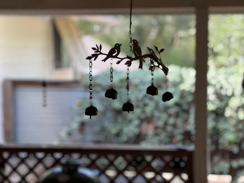 I love looking at this mobile hanging in my garden. The colorful bells make me smile. The sun on the birds creates sweet shadows.