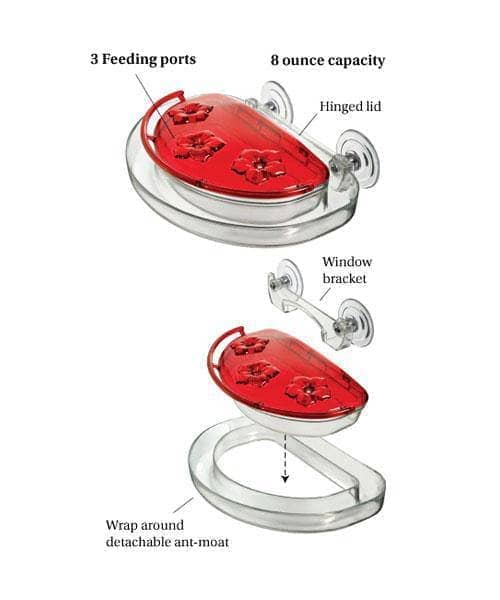 A semicircular reservoir holds 8 ounces of nectar, and three flower shaped feeding ports offer room for a few birds to dine at once. The raised perch around the feeder lends the hummingbirds a place to rest, while creating a natural feeding position. Surround the feeder with the included ant moat to protect the nectar from insects.
